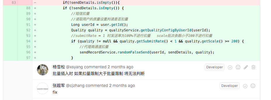 利用讨论(Discussion)进行代码评审(code review),每当有人进行了提交之后,在系统的信息流上都可以看到这个提交的具体改动,作为项目技术负责人可以及时的了解提交情况,并针对此次提价的代码修改内容进行评论,可以细化到每一行,评论的信息系统会自动发送邮件给相关负责人,可以重复利用这个特性来做代码评审.